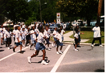 The students at Emily Spong Elementary School are involveed in many different activities during the school year. There is a cadet club, drill team, cheering squad, and majorette squad. They participate in all citywide parades and are used as ushers for special programs in the building. These students are often chosen to prevent behavior problems. A pictorial of the students participating in the program is included.